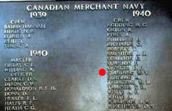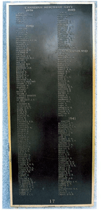 The names of 56 casualties lost at sea are recorded on the Tower Hill Memorial in London - 55 of them on panel 9 and 1 on panel 4. Walter Varley Standing's name is on panel 17 of the Halifax Memorial in Canada . The photograph of this panel has been kindly sent by Steve Douglas, co-ordinator of The Maple Leaf Legacy - A Project in Remembrance of Canada's War Dead.