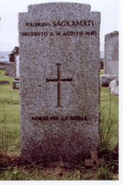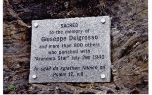 Although the bodies of several victims were recovered from the shores of Colonsay and Oronsay in the months following the sinking [probably nine in all, KB] details are only known about four of them. As well as Private Jack Edmonds who was one of the military guard and Walfrido Sagramati, one of the Italian internees, the body of Giuseppe Delgrosso was found by islander Donald McNeill and his son whilst they were out gathering sheep along Colonsay's wild western coastline. Giuseppe was born on 20 April 1889 and was a native of the small town of Borgo Val di Taro in Tuscany . At the time of his arrest he had been living in Hamilton near Glasgow, running the family business. He was identified from a scrap of paper bearing his name which was found in his pocket and he was buried near to where he was found at a place called Leum a' Bhriar. His grave was marked with stones and a wooden cross and, later, flowers were placed there by islanders and a photograph sent to his family in Hamilton to where his body was returned after the war. It is on the cliffs close to where Giuseppe was buried, that on 2 July 2005, a small inscribed granite plaque in memory of him, his fellow countrymen and all those who died, was unveiled. A memorial cairn was constructed nearby and each year a wreath is laid on the anniversary of the tragic event. [Full details of this will follow.]