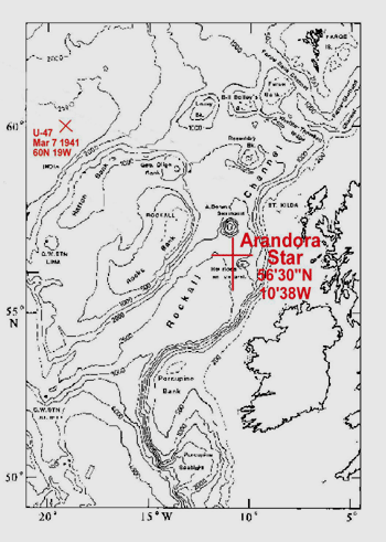 At 4.00 a.m. on 1 July 1940 the SS Arandora Star left Liverpool under the command of her Master, Captain E.W. Moulton, and headed northwards up the Irish Sea on what was to become her final voyage. In addition to her crew of 182 officers and men, she was carrying over 1,300 German and Italian nationals together with a military guard of 254 officers and men under the command of Major C. A. Bethell. As dawn broke on 2 July, the SS Arandora Star found herself some 75 miles north-west of Bloody Foreland, County Donegal, barely one day into her voyage to St. John's, Newfoundland , when she was spotted by lookouts aboard a German U-boat which was cruising slowly on the surface. Zig-zagging towards them in the light rain, they observed a large ship steaming at 15 knots, alone and unescorted yet making regular changes of course - a tactic used to avoid submarine attack. U-47 was at the time commanded by Kapitanleutnant Gunther Prien, one of Germany 's top U-boat aces, who was making his way back to base at Wilhelmshaven after a successful patrol in the North Atlantic where he had sunk eight allied merchant ships. Prien had only one torpedo left and after diving and approaching to within 2500 metres, at just before 7.00 am he fired, striking the SS Arandora Star amidships. Seeing the vessel starting to settle towards the stern and the first lifeboats being lowered, Prien and the crew of U-47 continued on their way believing that they had achieved another successful strike, yet totally unaware as to the destination, nationality and status of the passengers aboard the stricken vessel. At 7.20 a.m. the SS Arandora Star rolled over and with her Captain and senior officers still on the bridge, plunged stern first down into the sea carrying with her no doubt many other souls who had been either unable or unwilling the leave the vessel. Today the wreck of the SS Arandora Star lies in just over 2000 metres of water in the Rockall Channel, position 56'30N, 10'38W.